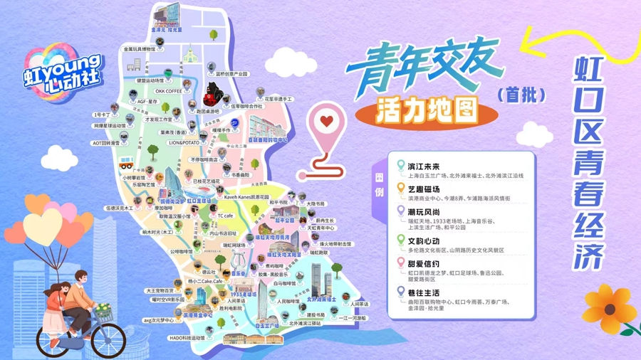 现场还点亮了虹口区“青春经济·青年交友”活力地图,将通过开展线下主题社交活动,串联起百余个商户,以轻社交、高频次、小切口助力传统商业“破圈”,拥抱青年社交。